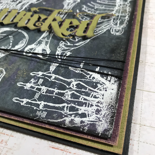 I started with the background, cut a piece of watercolor cardstock, inked it with Walnut stain Distress ink and spritzed with water. Inked the edges with the same ink. Then I stitched around the edges with my sewing machine, using zig zag and straight seam randomly. After that I used Walnut stain Distress crayon on the edges. Now it’s time for the THS 010 Eyechart stencil and black modelling paste. Let dry. Apply some translucent Grit paste on random places. Let dry completely. Then Walnut stain crayon on top of the Grit paste. I splattered some black acrylic paint with my Splat brush and finally stamped some spiderwebs from CMS346, Tangled web.